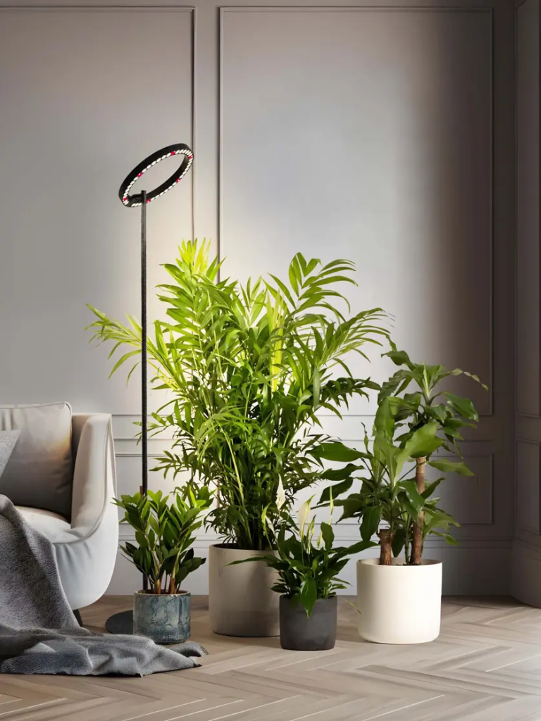 This sleek, versatile floor grow light features a halo-shaped head that pivots and tilts, allowing you to direct light precisely where your plants need it.