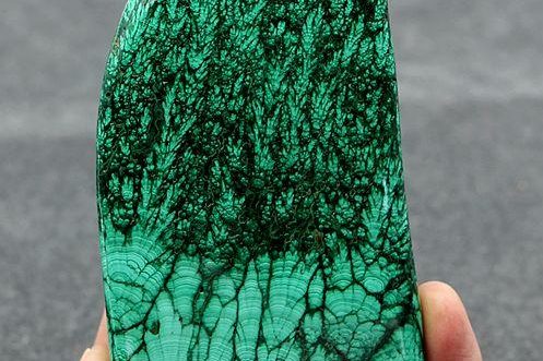 Malachite, a vibrant green copper carbonate mineral, is renowned for its striking concentric banding and swirling patterns. Its rich, deep green hues, often displaying varying shades from light to dark, create a mesmerizing, velvety appearance. This unique visual appeal, coupled with its historical significance, makes it a highly prized and distinctive ornamental stone.