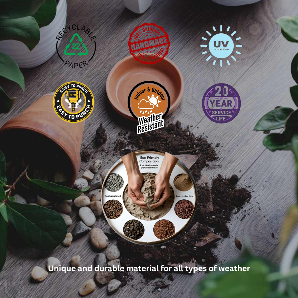 Our products are thoughtfully made from a unique blend of 60% natural stone powder and 40% recycled plastic powder — combining the strength of stone with the resilience of plastic, all while reducing environmental impact.